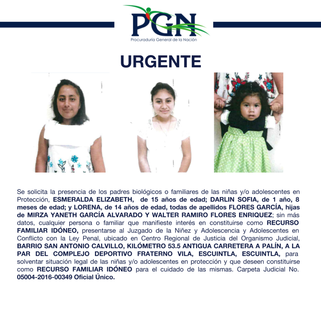 ESMERALDA ELIZABETH, DARLIN SOFIA, LORENA, todas de apellidos FLORES GARCÍA PGN Comunicación Social hace 7 años ESMERALDA ELIZABETH, DARLIN SOFIA, LORENA, todas de apellidos FLORES GARCÍA Por: Comunicación Social Comparte en redes sociales