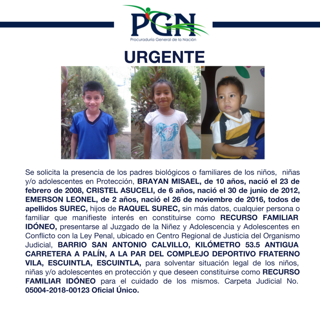 BRAYAN MISAEL, CRISTEL ASUCELI, EMERSON LEONEL todos de apellidos SUREC PGN Comunicación Social hace 7 años BRAYAN MISAEL, CRISTEL ASUCELI, EMERSON LEONEL todos de apellidos SUREC Por: Comunicación Social Comparte en redes sociales
