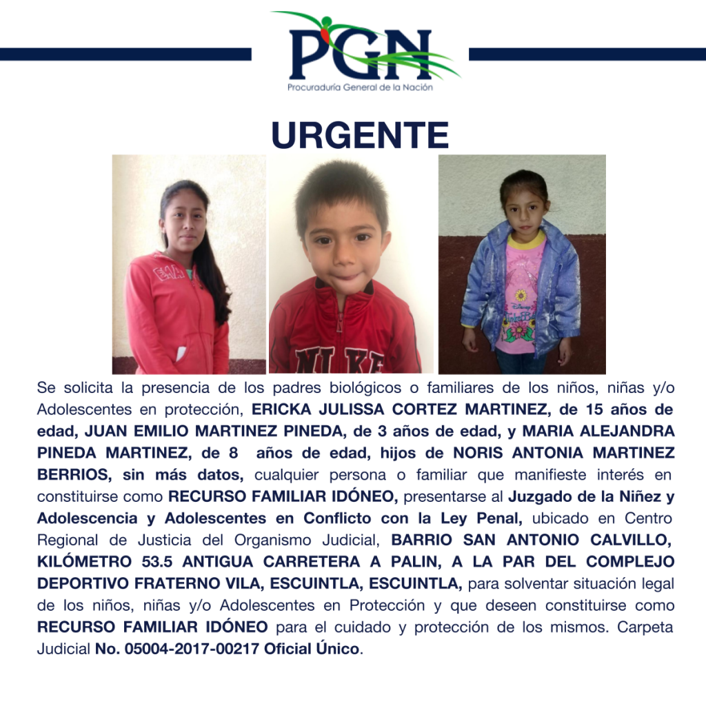 ERICKA JULISSA CORTEZ MARTINEZ, JUAN EMILIO MARTINEZ PINEDA, MARIA ALEJANDRA PINEDA MARTINEZa PGN Comunicación Social hace 7 años ERICKA JULISSA CORTEZ MARTINEZ, JUAN EMILIO MARTINEZ PINEDA, MARIA ALEJANDRA PINEDA MARTINEZ Por: Comunicación Social Comparte en redes sociales