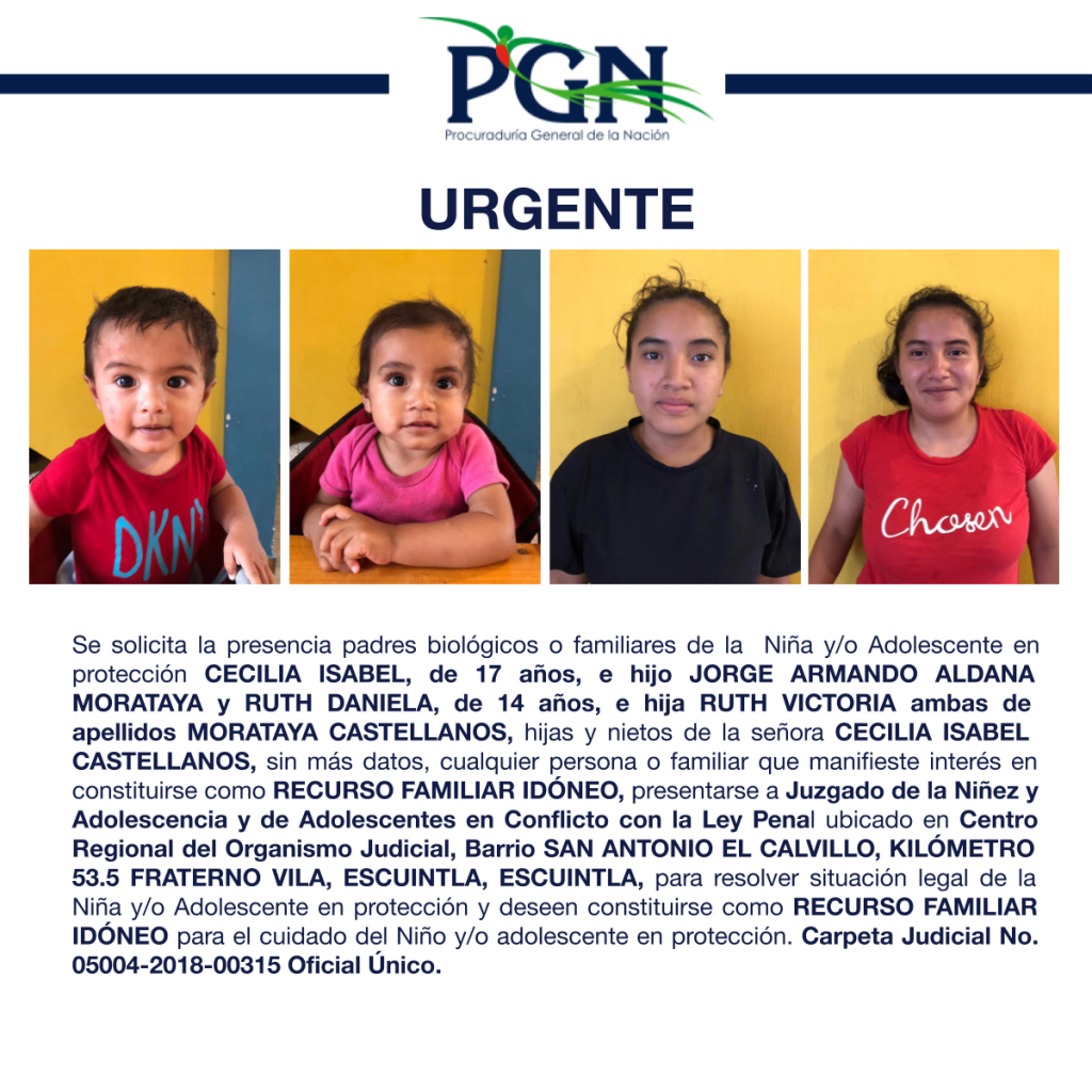 CECILIA ISABEL, e hijo JORGE ARMANDO ALDANA MORATAYA y RUTH DANIELA, de 14 años, e hija RUTH VICTORIA ambas de apellidos MORATAYA CASTELLANOS PGN Comunicación Social hace 6 años CECILIA ISABEL, e hijo JORGE ARMANDO ALDANA MORATAYA y RUTH DANIELA, de 14 años, e hija RUTH VICTORIA ambas de apellidos MORATAYA CASTELLANOS Por: Comunicación Social Comparte en redes sociales