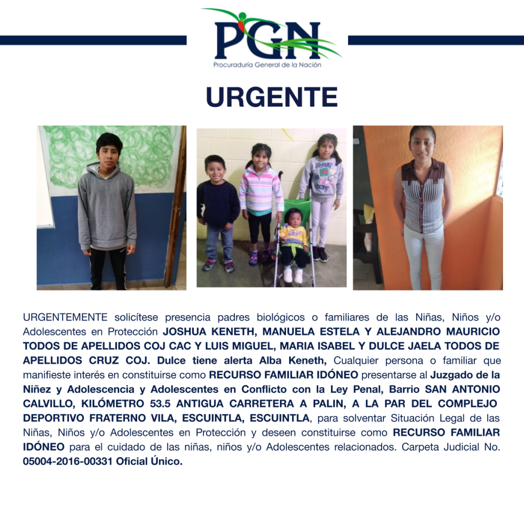 JOSHUA KENETH, MANUELA ESTELA Y ALEJANDRO MAURICIO TODOS DE APELLIDOS COJ CAC Y LUIS MIGUEL, MARIA ISABEL Y DULCE JAELA TODOS DE APELLIDOS CRUZ COJ.