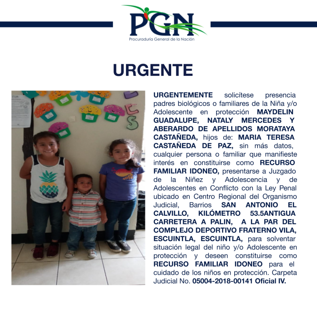 MAYDELIN GUADALUPE, NATALY MERCEDES Y ABERARDO DE APELLIDOS MORATAYA CASTAÑEDA PGN Comunicación Social hace 5 años MAYDELIN GUADALUPE, NATALY MERCEDES Y ABERARDO DE APELLIDOS MORATAYA CASTAÑEDA Por: Comunicación Social Comparte en redes sociales