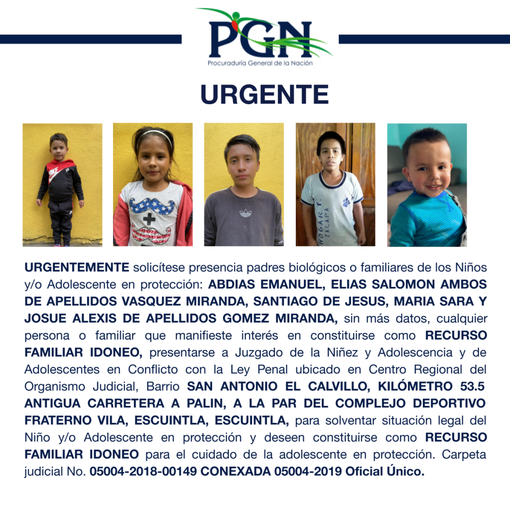 ABDIAS EMANUEL, ELIAS SALOMON AMBOS DE APELLIDOS VASQUEZ MIRANDA, SANTIAGO DE JESUS, MARIA SARA Y JOSUE ALEXIS DE APELLIDOS GOMEZ MIRANDA PGN Comunicación Social hace 5 años ABDIAS EMANUEL, ELIAS SALOMON AMBOS DE APELLIDOS VASQUEZ MIRANDA, SANTIAGO DE JESUS, MARIA SARA Y JOSUE ALEXIS DE APELLIDOS GOMEZ MIRANDA Por: Comunicación Social Comparte en redes sociales
