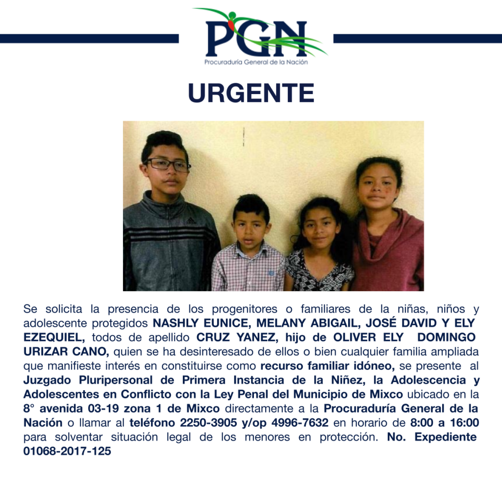 NASHLY EUNICE, MELANY ABIGAIL, JOSÉ DAVID Y ELY EZEQUIEL, todos de apellido CRUZ YANEZ PGN Comunicación Social hace 5 años NASHLY EUNICE, MELANY ABIGAIL, JOSÉ DAVID Y ELY EZEQUIEL, todos de apellido CRUZ YANEZ Por: Comunicación Social Comparte en redes sociales