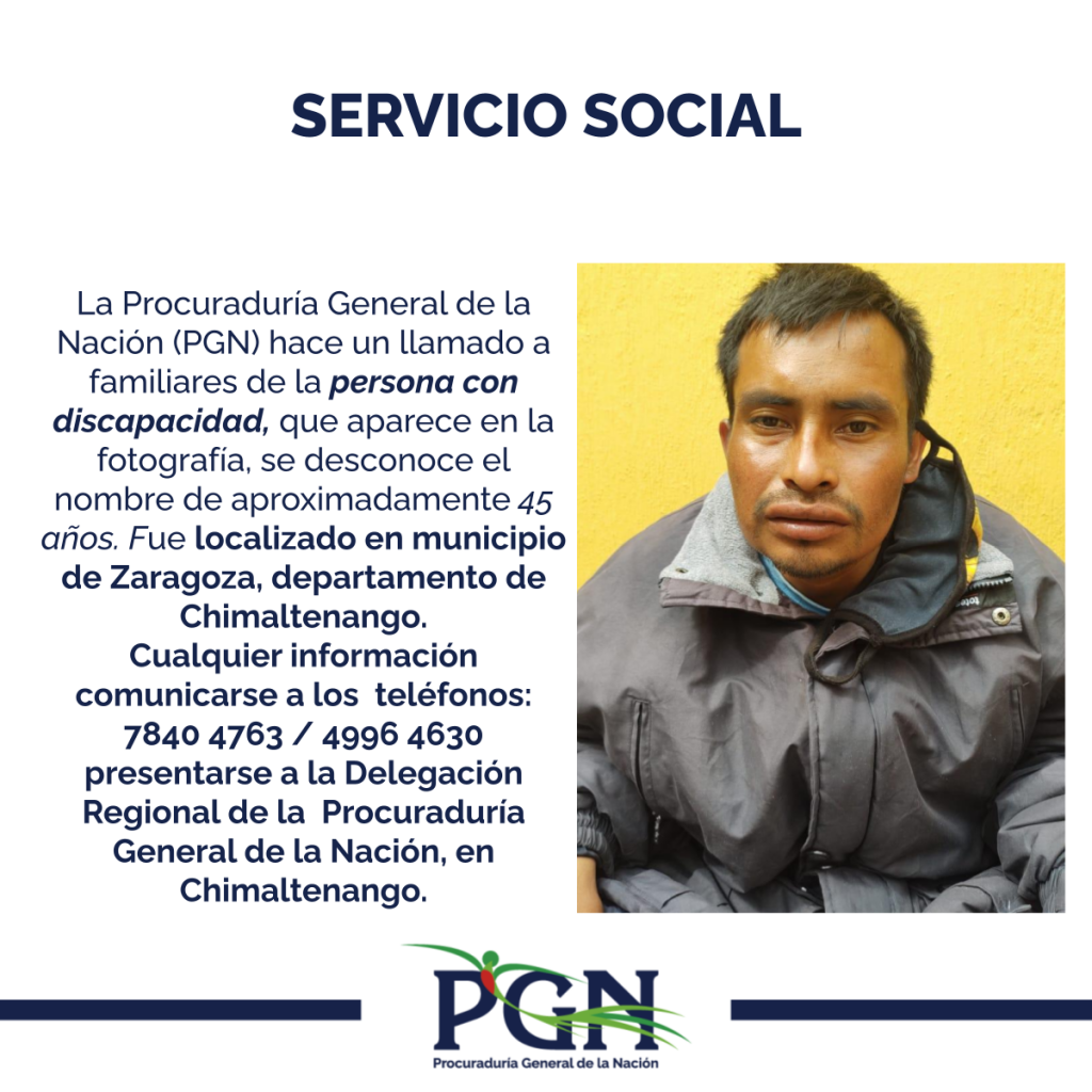 Persona con Discapacidad, se desconoce el nombre de aproximadamente 45 años. PGN Comunicación Social hace 5 años Persona con Discapacidad, se desconoce el nombre de aproximadamente 45 años. Por: Comunicación Social Comparte en redes sociales