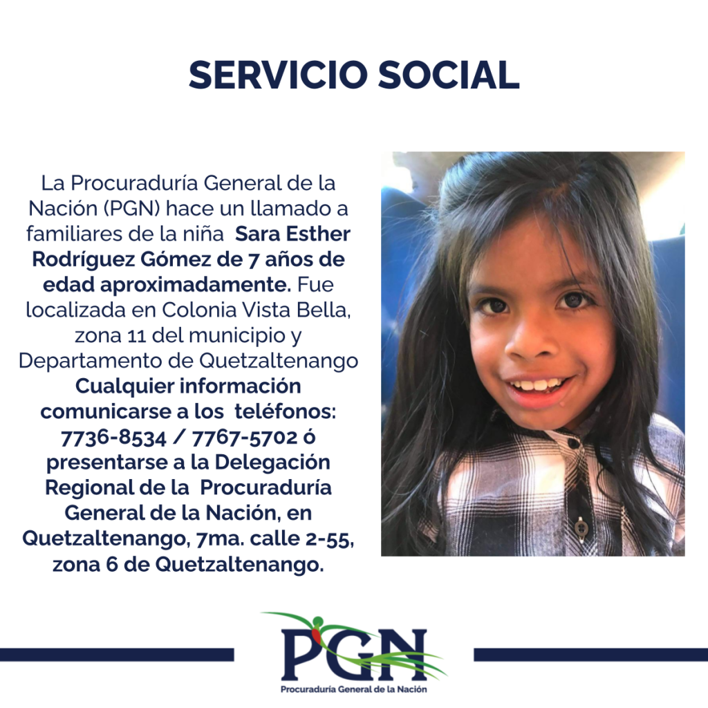 Sara Esther Rodríguez Gómez de 7 años de edad aproximadamente PGN Comunicación Social hace 5 años Sara Esther Rodríguez Gómez de 7 años de edad aproximadamente Por: Comunicación Social Comparte en redes sociales