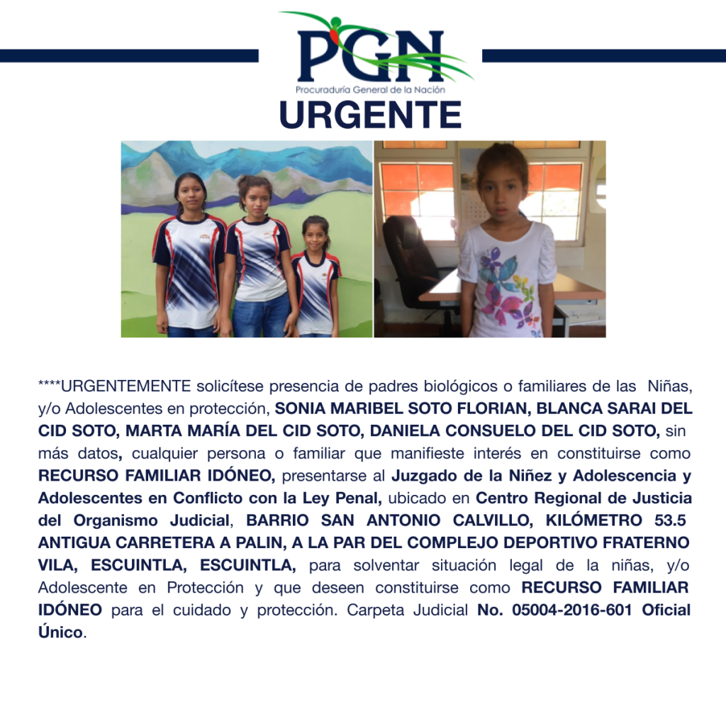 SONIA MARIBEL SOTO FLORIAN, BLANCA SARAI DEL CID SOTO, MARTA MARÍA DEL CID SOTO, DANIELA CONSUELO DEL CID SOTO PGN Comunicación Social hace 5 años SONIA MARIBEL SOTO FLORIAN, BLANCA SARAI DEL CID SOTO, MARTA MARÍA DEL CID SOTO, DANIELA CONSUELO DEL CID SOTO Por: Comunicación Social Comparte en redes sociales