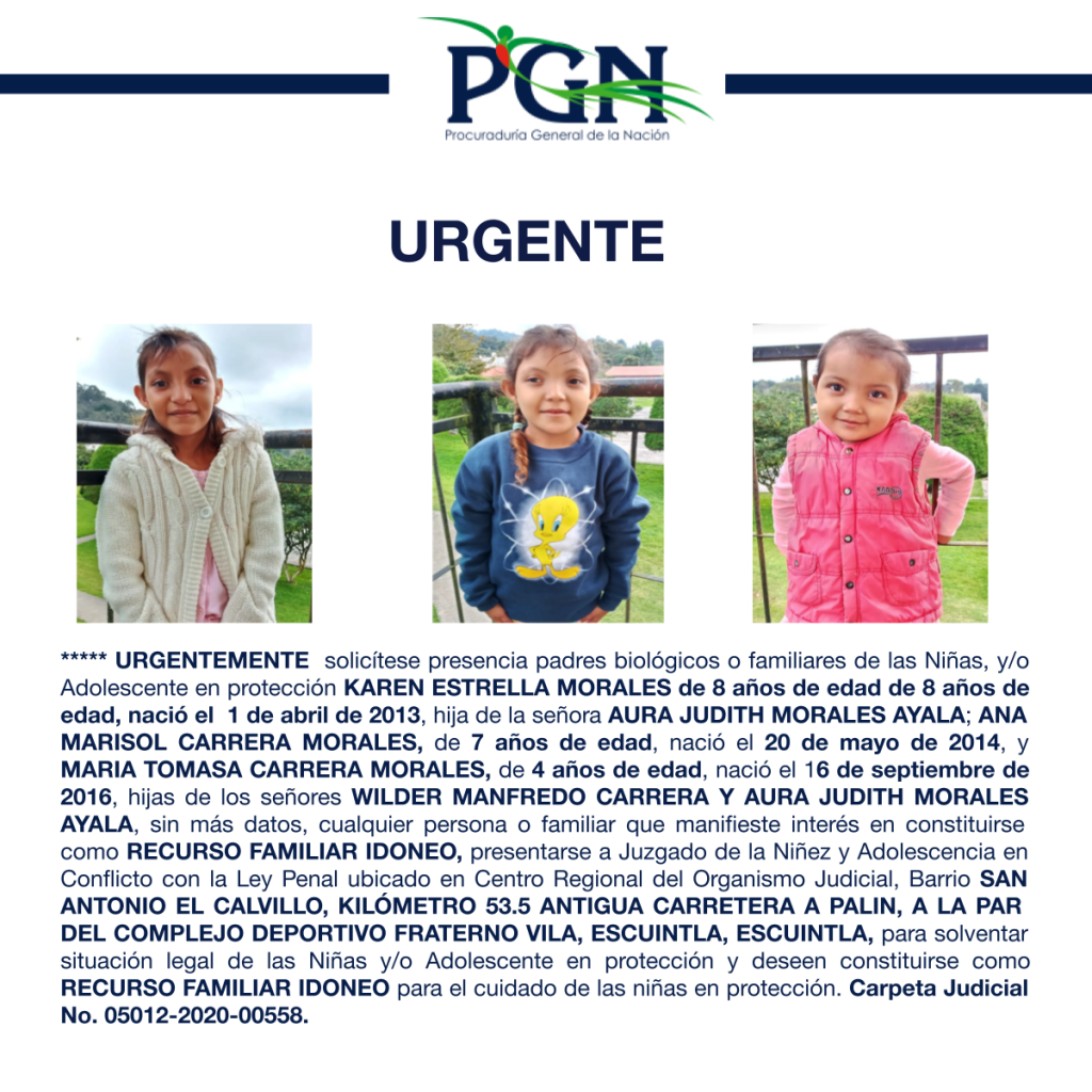 KAREN ESTRELLA MORALES, AURA JUDITH MORALES AYALA, ANA MARISOL CARRERA MORALES PGN Comunicación Social hace 4 años URGENTE