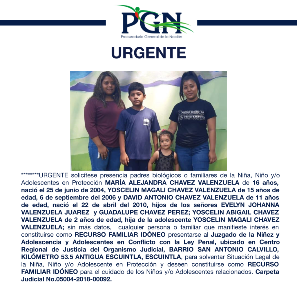 MARÍA ALEJANDRA CHAVEZ VALENZUELA, YOSCELIN MAGALI CHAVEZ VALENZUELA, DAVID ANTONIO CHAVEZ VALENZUELA, YOSCELIN ABIGAIL CHAVEZ VALENZUELA PGN Comunicación Social hace 4 años URGENTE